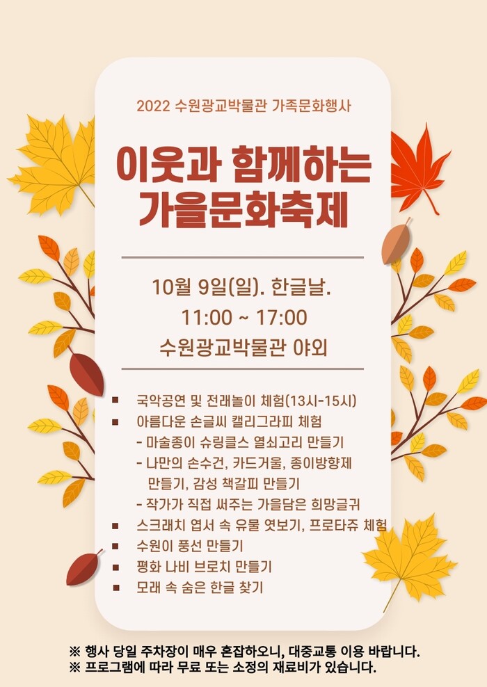 수원광교박물관은 9일 오전 11시부터 오후 5시까지 박물관 야외에서 ‘이웃과 함께하는 가을문화축제’를 연다.