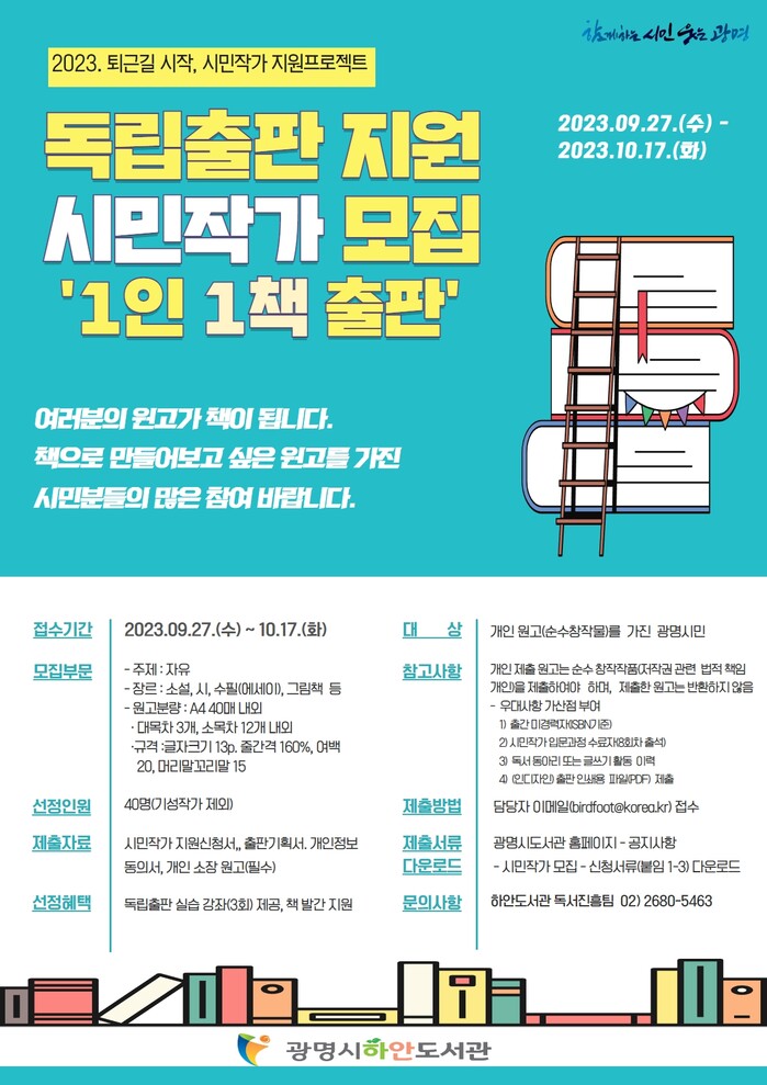 광명시(시장 박승원) 하안도서관은 평소 책 읽기와 글쓰기에 관심을 가지고 나의 얘기를 책으로 만들고 싶은 시민을 대상으로 ‘독립출판 지원 시민작가’ 40명을 이달 17일까지 모집한다.