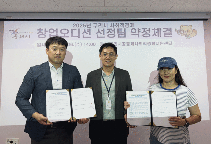 구리시(시장 백경현)는 지난 6일(수) 구리시 공동체사회적경제지원센터 에서 ‘2025년 사회적경제 창업오디션’ 최종 선정팀과 약정체결식을 개최하고 본격적인 지원에 들어갔다.