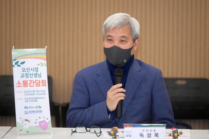 곽상욱 오산시장은 19일 관내 전체 42개교 초‧중‧고 교장선생님들이 참석한 가운데 새로 문을 연 오산반려동물테마파크에서 2022년 오산시 미래교육을 위한 소통 간담회를 진행했다.