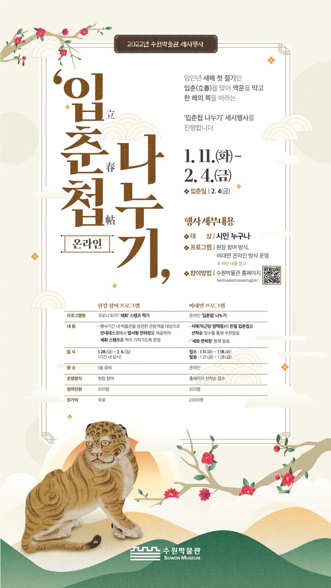 1월 11일부터 18일까지 비대면으로 진행되는 ‘온라인 입춘첩 나누기’는 수원박물관 홈페이지(https://swmuseum.suwon.go.kr)에서 참가 신청을 해야 한다(선착순 200명). 참가비는 2000원이다.