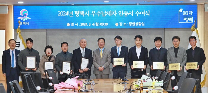 평택시(시장 정장선)는 지난 4일 시청 종합상황실에서 지방세를 성실하게 납부하여 시 재정확충에 기여한 주식회사 에이치알에스 등 법인 6곳과 개인 8명을 ‘2024년 평택시 우수납세자’로 선정하여 인증서와 인증패를 수여했다.