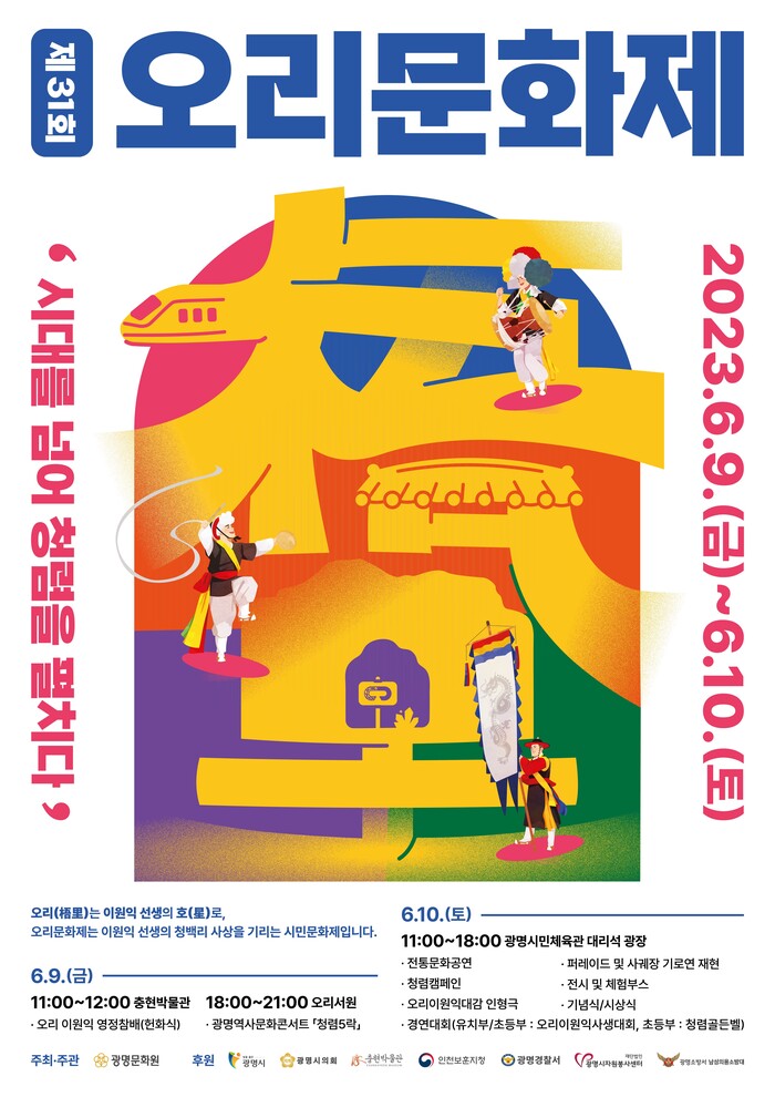 광명시(시장 박승원) 대표 시민문화축제인 오리문화제가 ‘시대를 넘어 청렴을 펼치다’라는 부제로 6월 9일, 10일 이틀 동안 충현박물관과 광명시민체육관에서 열린다.