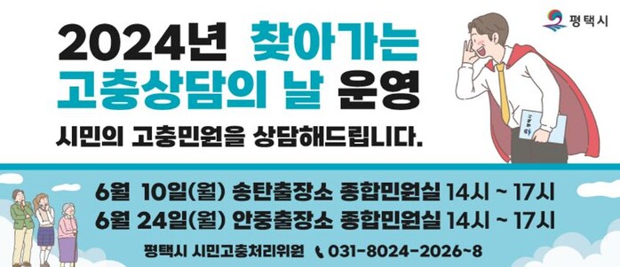 평택시 시민고충처리위원실은 오는 10일(송탄출장소 종합민원실)과 24일(안중출장소 종합민원실)에 14시부터 17시까지 ‘찾아가는 고충상담의 날’을 운영한다고 밝혔다.