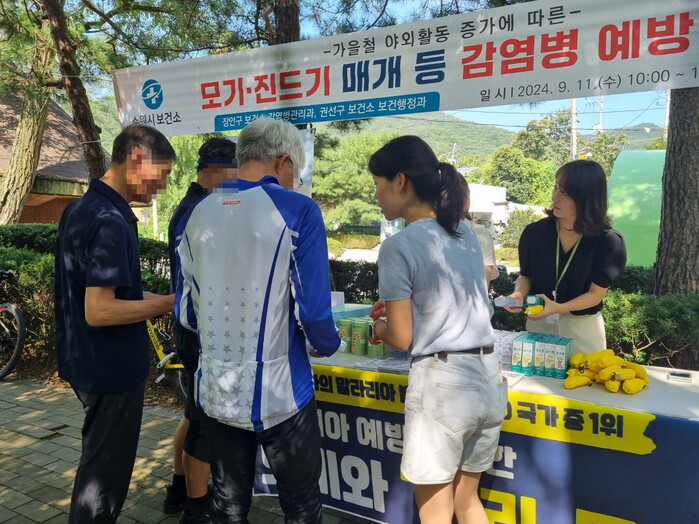 수원시보건소 관계자는 “벌초와 성묘, 농작업 등 야외활동이 증가하는 가을철에 진드기·모기 매개 감염병이 많이 발생하므로 주의가 필요하다”며 “지속해서 시민들을 대상으로 다양한 감염병 예방 홍보 캠페인을 전개하겠다”고 밝혔다.