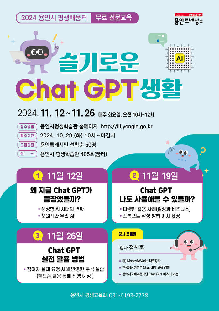용인특례시(시장 이상일)는 용인시 평생학습관(수지)이 마련한 ‘슬기로운 Chat GPT 생활’ 특강 참가자를 모집한다고 24일 밝혔다.