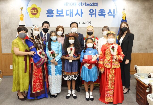 장현국 의장은 이날 오후 의장 접견실에서 가수 주미를 비롯해 가수 겸 유튜버 예빛, 영화배우 이원화, 탤런트 이가현 등 5명과 음악공연 전문단체 ‘아름드리 다문화합창단’ 등 1개 팀을 ‘제10대 경기도의회 신규 홍보대사’로 임명했다. 일정 관계로 불가피하게 위촉식에 불참한 가수 진시몬을 대신해 관계자에 위촉패와 임명장을 전달했다.