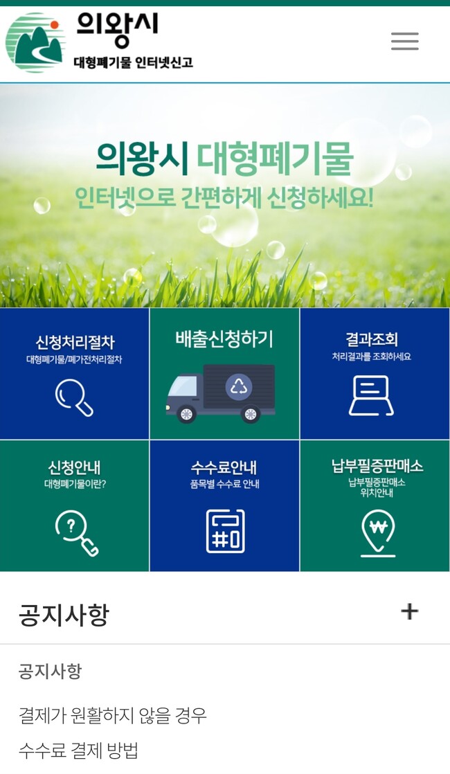 신고방법은 별도의 앱 설치 없이 포털사이트 검색창에‘의왕시 대형폐기물’로 검색하면 바로 접속할 수 있으며, 배출신고 및 결제 후 신고필증 번호를 폐기물에 표기하여 배출하면 된다.