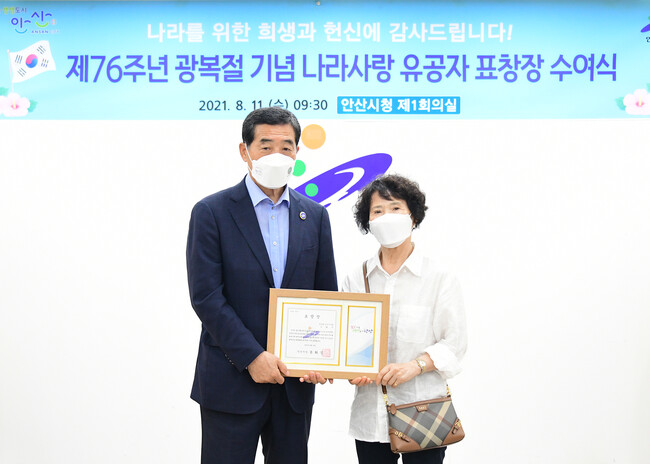 [로컬라이프] 윤화섭 안산시장은 11일, 제76주년 광복절을 기념해 독립유공자 고(故) 손태준(1911~1950) 선생의 딸 손화자 씨에게 ‘나라사랑 유공자 표창장’을 수여했다고 밝혔다.