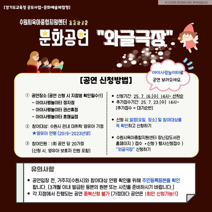 ‘와글극장’은 미취학 영유아 가족 20가정을 대상으로 아이사랑놀이터 정자점, 권선휴점, 호매실점에서 각각 공연을 진행한다. 회당 약 50명 규모로 총 3회 운영된다.