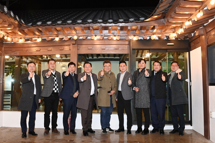사진/이재준 수원시장(왼쪽 4번째)이 막걸리 간담회에 참석한 기업인들과 함께하고 있다.(사진제공=수원시)