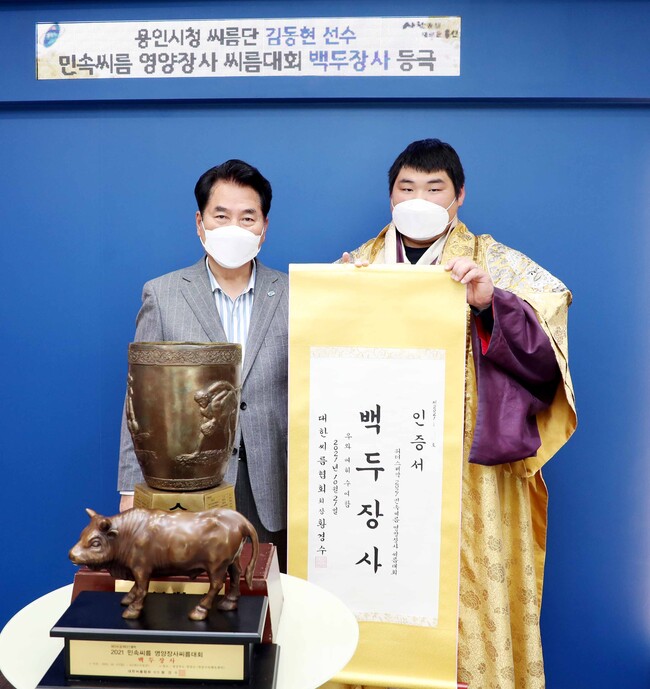 이에 백 시장은 이날 용인시청에서 열린 트로피 봉납식에서 김동현 선수를 축하하고, 묵묵히 용인시청씨름단을 이끌어 온 장덕제 감독과 우형원 코치를 격려했다.