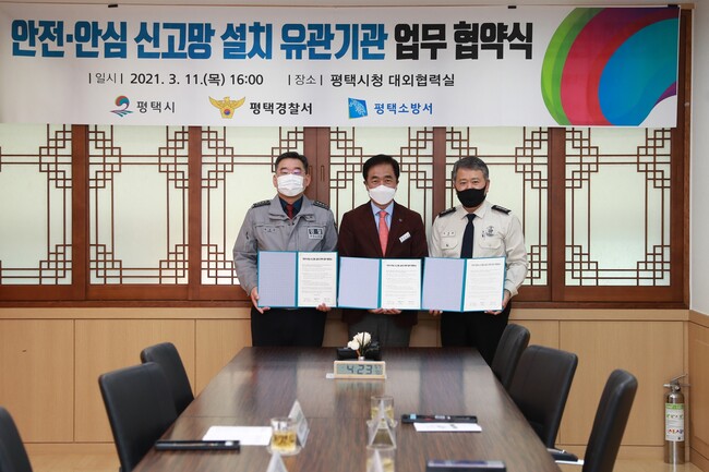평택시(시장 정장선)는 평택경찰서 및 평택소방서와 함께 통복천 일원 자전거도로에 태양광 LED형 안전・안심 신고망 설치를 위한 업무 협약식을 평택시장, 평택경찰서장(총경 송병선), 평택소방서장(소방정 한경복) 등이 참석한 가운데 지난 11일 평택시청 대외협력실에서 개최했다.