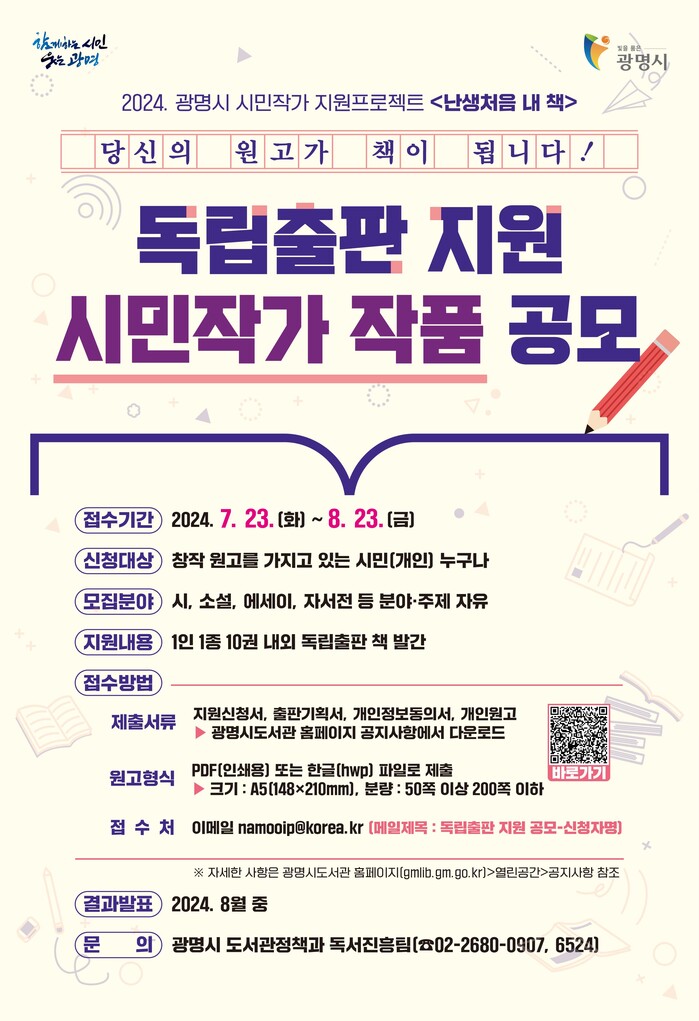 참여를 원하는 시민은 광명시도서관 누리집(gmlib.gm.go.kr) 공지 사항에서 제출 서류를 내려받은 후 원고와 함께 담당자 이메일(namooip@korea.kr)로 제출하면 된다. 자세한 사항은 도서관정책과(02-2680-0907)로 문의하면 안내받을 수 있다.