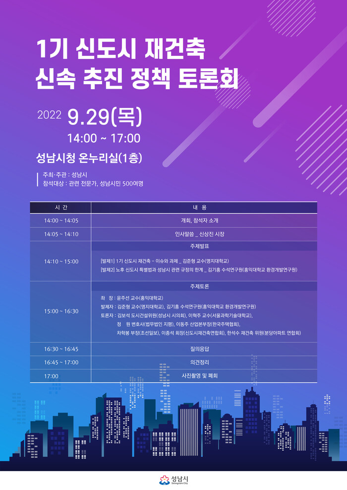 사진/도시정비과-성남시, 9월 29일 1기 신도시 재건축 신속 추진 정책토론회 개최 안내 포스터(성남시 제공)