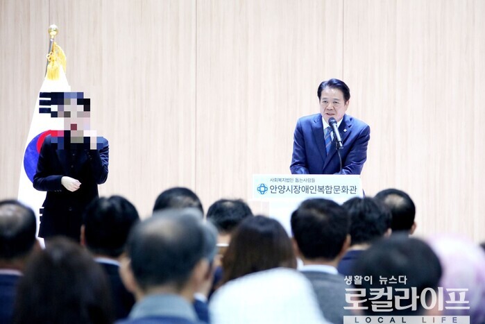 | ▲ 최대호 안양시장이 ‘안양시 장애인복합문화관 개관식’에서 인사말을 하고 있다. (사진출처=최대호 페이스북) |