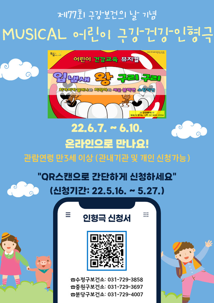 성남시는 제77회 구강보건의 날(6.9)을 기념해 어린이 구강건강 뮤지컬 ‘입 냄새 왕 구리구리’ 공연을 오는 6월 7일부터 10일까지 온라인으로 선보인다.