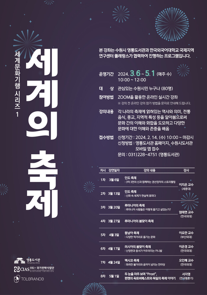 수원시 영통도서관이 한국외국어대학교와 협력해 운영하는 강좌 ‘세계의 축제’ 참가자를 선착순으로 모집한다.