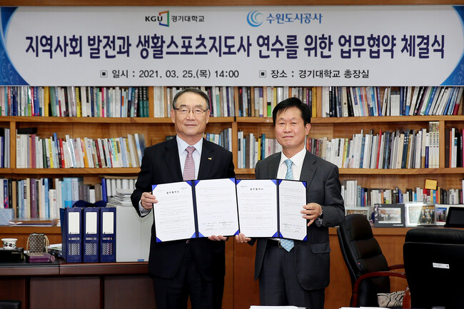 수원도시공사(사장 이상후)가 경기대학교와 함께 우수한 체육지도자 양성을 위해 나섰다. 25일 공사에 따르면 공사는 이날 경기대학교 생활체육지도자연수원에서 ‘지역사회 발전과 생활스포츠지도사 연수를 위한 업무협약식’을 가졌다.