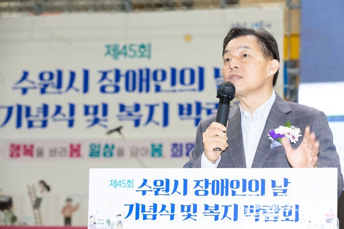 | ▲ 이재준 수원특례시장이 ‘제45회 수원시 장애인의 날 기념식 및 복지 박람회’에 참석해 축사를 하고 있다. (사진출처=이재준 페이스북) |