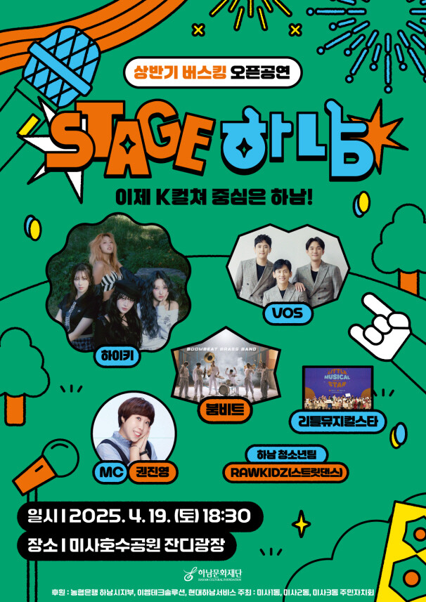 하남시와 하남문화재단이 오는 4월 19일 토요일 저녁 6시 30분, 미사호수공원 잔디광장에서 ‘2025 Stage 하남! 버스킹’의 화려한 시작을 알리는 오픈공연을 연다.