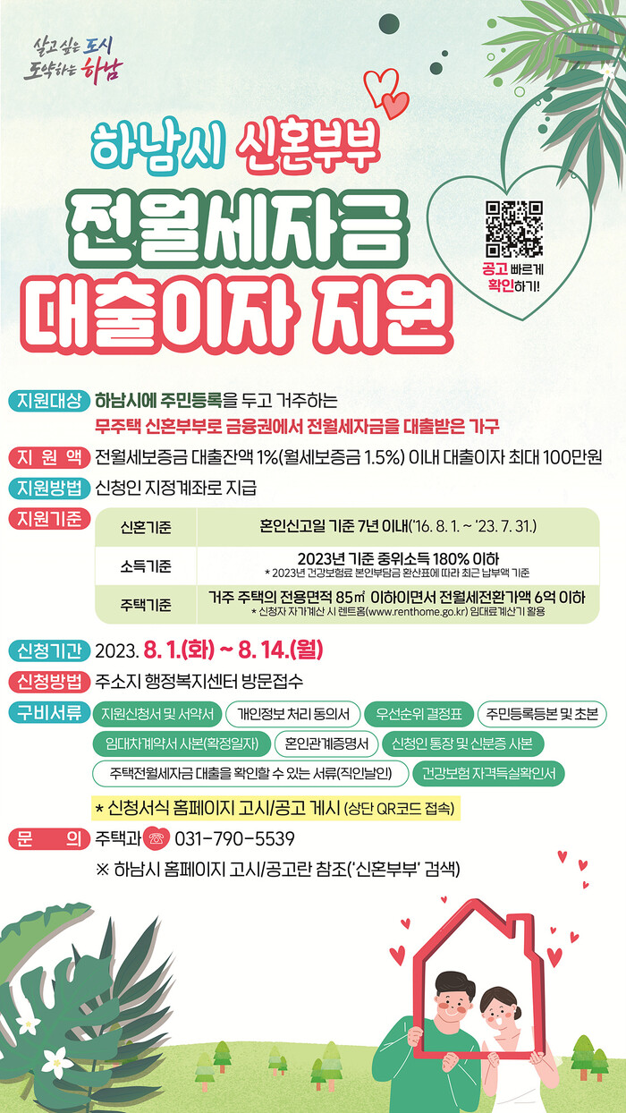 신혼부부 전월세자금 대출이자 지원사업에 대한 자세한 내용은 하남시 홈페이지에서 ‘신혼부부’로 검색하거나 ‘하남소식 → 고시/공고 게시판’을 통해 확인할 수 있다.