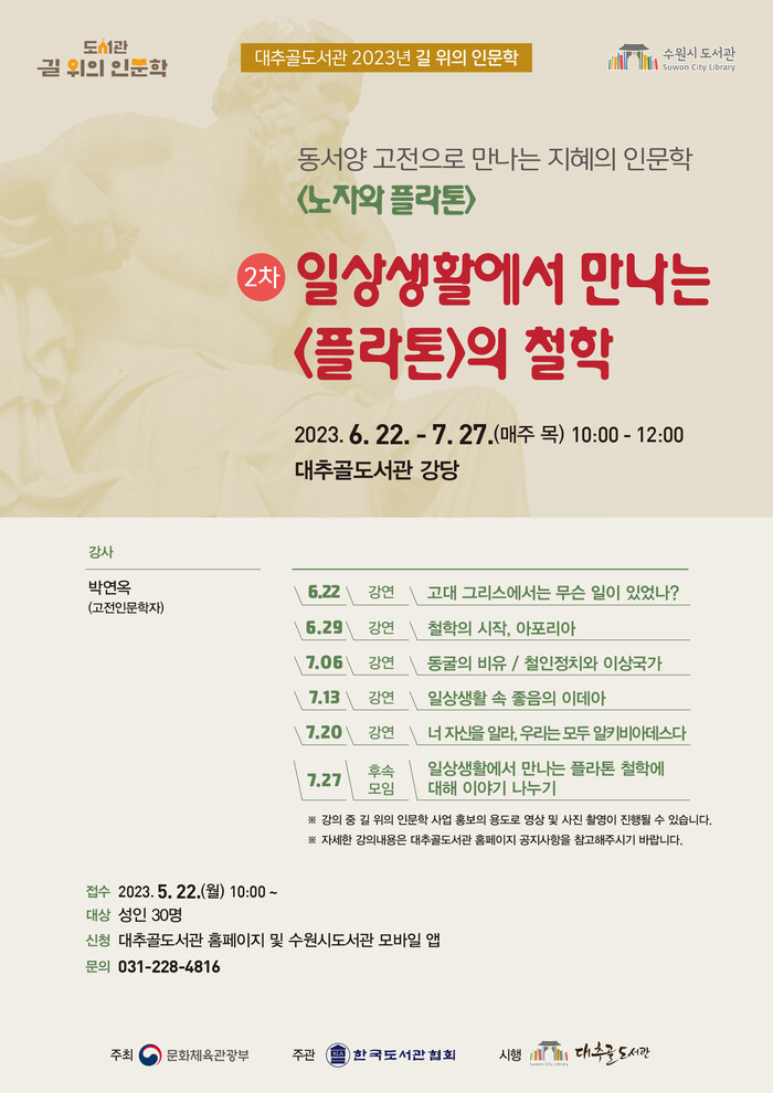 수원시 대추골도서관이 2023년 길 위의 인문학 ‘노자와 플라톤 : 2차 일상생활에서 만나는 <플라톤>의 철학’ 수강생을 22일 오전 10시부터 모집한다.