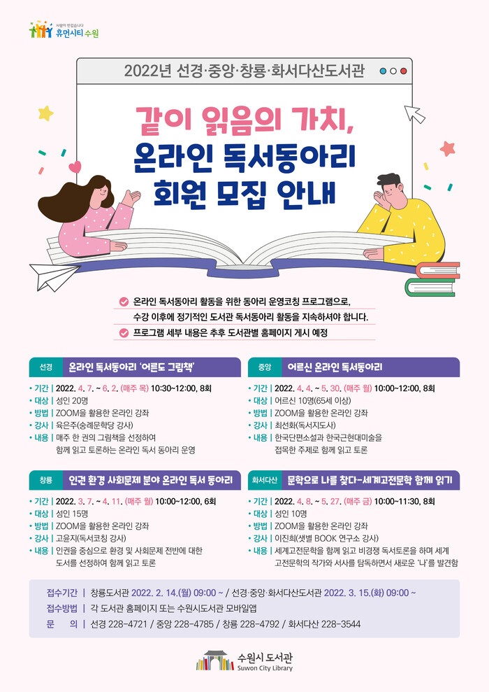 수원시 도서관 관계자는 “온라인 플랫폼을 활용해 시간적·공간적 제약에서 벗어난 새로운 독서 모임을 운영하겠다”며 “더 많은 시민이 책과 가까워질 기회를 얻고, 개인의 독서 활동이 공동체 활동으로 확장되는 계기가 될 것”이라고 기대했다.