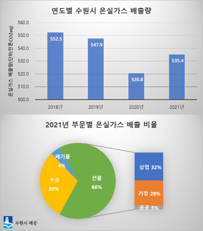 사진/ 연도별 수원시 온실가스 배출량 및 2021년 부문별 배출 비율.(수원시 제공)