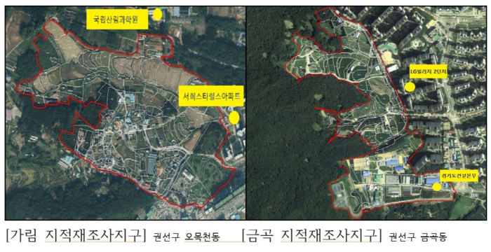 ‘가림 지적재조사지구’ 사업 대상은 권선구 오목천동 350-1번지 일원으로 전체 269필지(25만 7369㎡)이고, ‘금곡 지적재조사지구’ 사업 대상은 권선구 금곡동 509-3번지 일원으로 203필지(22만 7489㎡)이다.
