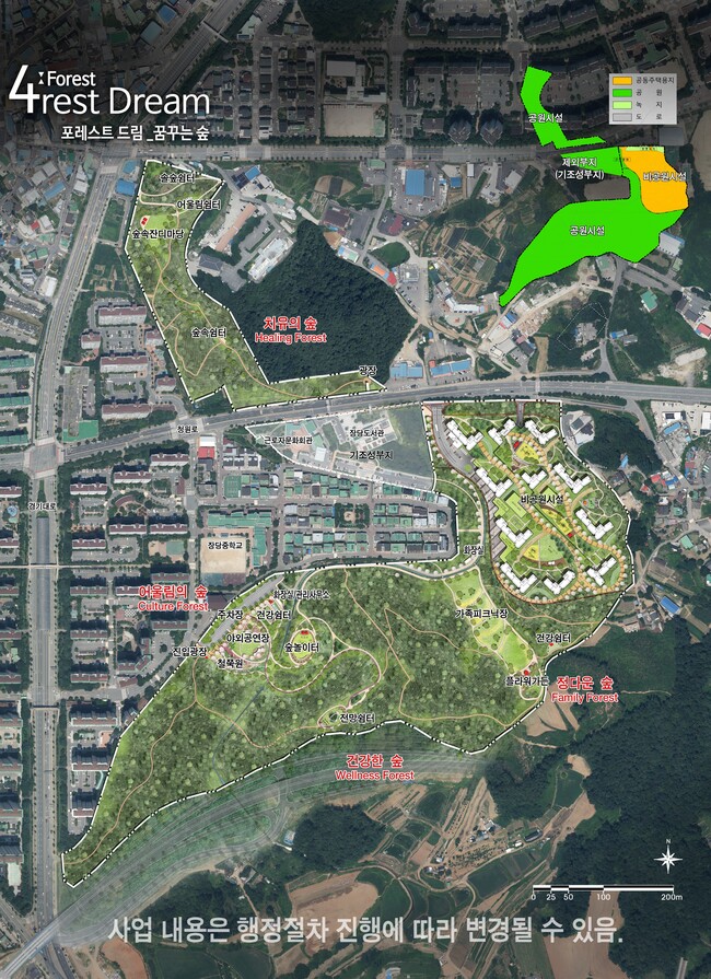 현재 1,140억 원을 투자해 보상절차가 마무리 단계에 있으며, 민간사업 총 면적은 25만5천㎡으로 5만5천㎡(22%)에 공동주택을 건설하고, 20만㎡(78%)에 공원을 조성해 평택시에 무상 기부채납하게 된다. 공사기간은 2022년부터 2024년까지이며, 숲속쉼터, 가족피크닉장, 플라워가든, 공연장 및 숲놀이터 등이 조성된다.