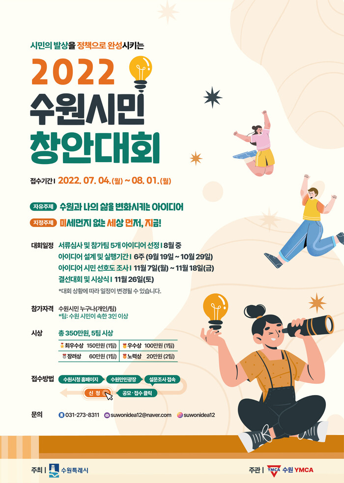 수원시 관계자는 “수원시민 창안대회는 시민의 참신한 아이디어를 정책으로 완성하는 과정”이라며 “참여 민주주의를 실현하는 대회가 될 것”이라고 말했다.