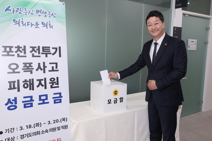경기도의회는 한미연합훈련 중 지난 6일 발생한 전투기 오폭사고와 관련해 피해 도민의 조속한 일상회복 지원을 위한 성금 모금을 3월 18일부터 20일까지 3일간 진행중이다.