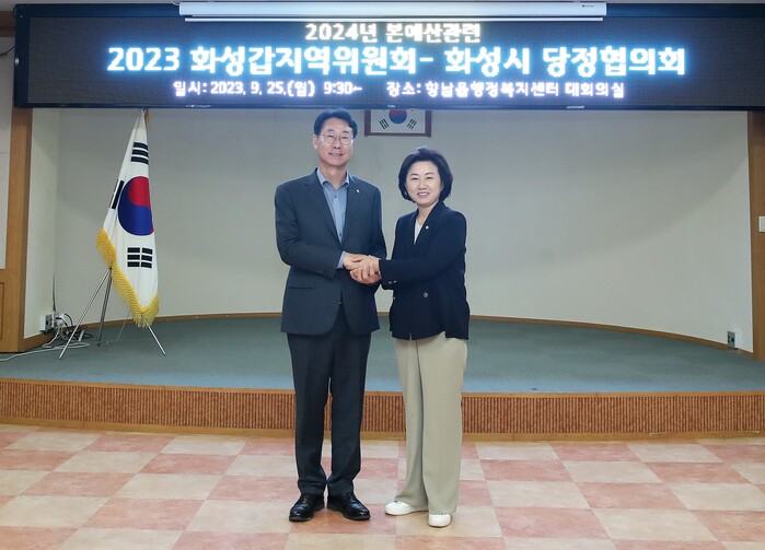 그외 ▲남양 어린이도서관 건립 ▲화성 서남부권역 지하차도 진입 자동차단시설 설치 ▲당하-오일 간 도로 확포장 공사 ▲새솔동 수변 정비 및 친수하천 조성 ▲화성시 서남부권 공원 쿨링포그 설치 ▲정남면 황구지천 둘레길 조성 및 편의시설 설치 ▲향남택지지구 육교 차양막 설치 ▲제부도 진입도로 개선 ▲화성시 걷기 활성화 ▲발안천 산책로 개선 등 지역 맞춤형 현안사업이 논의되었으며, 향후 지속적인 실무협의를 통해 추가 현안을 발굴하고 2024년 본예산 반영 또는 사업 추진에 대해 지속적으로 협의하기로 했다.