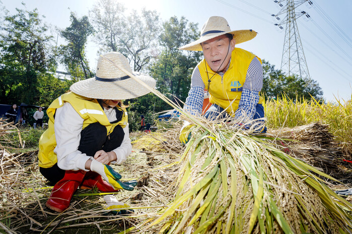 사진/이재준 수원특례시장이 벼베기를 하고 있다.(사진제공=수원시)