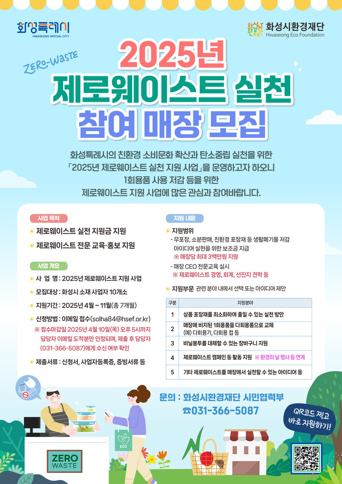 화성시환경재단이 오는 10일까지 1회용품 사용 저감 등의 친환경 소비 문화와 탄소중립 실천 확산을 위해 ‘2025년 제로웨이스트 실천 지원 사업’에 참여할 매장을 모집한다.