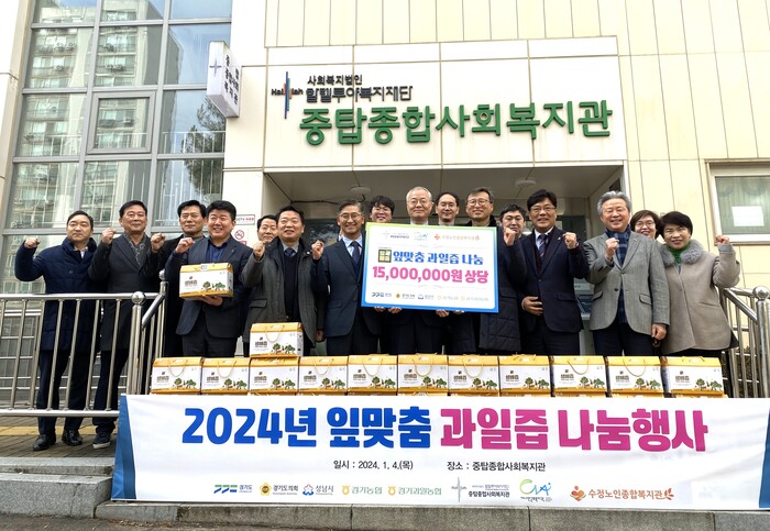 이들은 경기과일농협조공법인(경기지역 15개 농협이 출자한 법인)에서 기부한 1,500만원 상당의 경기도산 배즙 900상자를 지역 복지기관인 가나안근로복지관, 중탑종합사회복지관, 수정노인종합복지관에 나눠줬다.