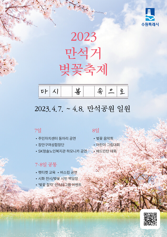 수원시를 대표하는 봄꽃 축제 ‘2023 만석거 벚꽃 축제’가 4월 7~8일 장안구 만석공원에서 열린다.