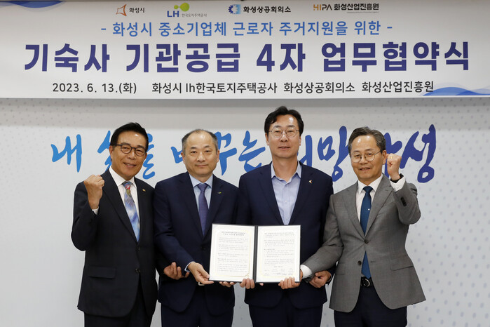 화성시(시장 정명근)가 13일 LH경기남부지역본부, 화성상공회의소, 화성산업진흥원과 함께 기업하기 좋은 도시 여건 조성을 위해 관내 LH건설 임대주택 500호를 중소기업체 기숙사로 공급하기 위한 협약을 체결했다.