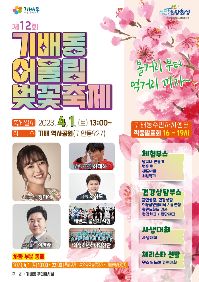 어울림 벚꽃축제 행사 일정 및 참여 문의는 기배동 행정복지센터(031-5189-4495)로 문의하면 된다.