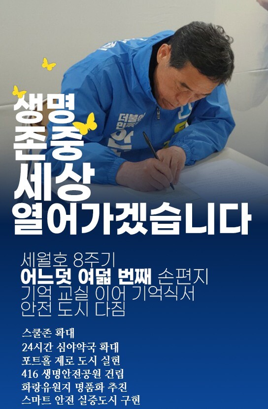 이어 어엿한 이십대 중반 청년이 되었을 아이들을 생각한다며, 아이들이 꿈꾸었던 세상을 생각한다. 우리는 계속해서 나아가야 한다. 안전한 나라, 안전한 도시 안산을 건설하겠다고 약속했다고 말했다.
