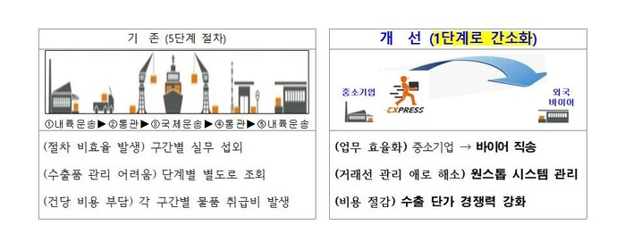 수출업체가 제품을 내륙운송 후 통관을 거쳐 해상·항공 운송으로 수입국까지 보내고, 통관을 거쳐 수입국에서 내륙운송까지 진행해야 하는 5단계 수출운송 절차를 수출업체가 바이어(구매자)에게 우체국 국제특급(EMS)으로 직배송하는 ‘도어 투 도어’(Door To Door) 방식으로 간소화했다.