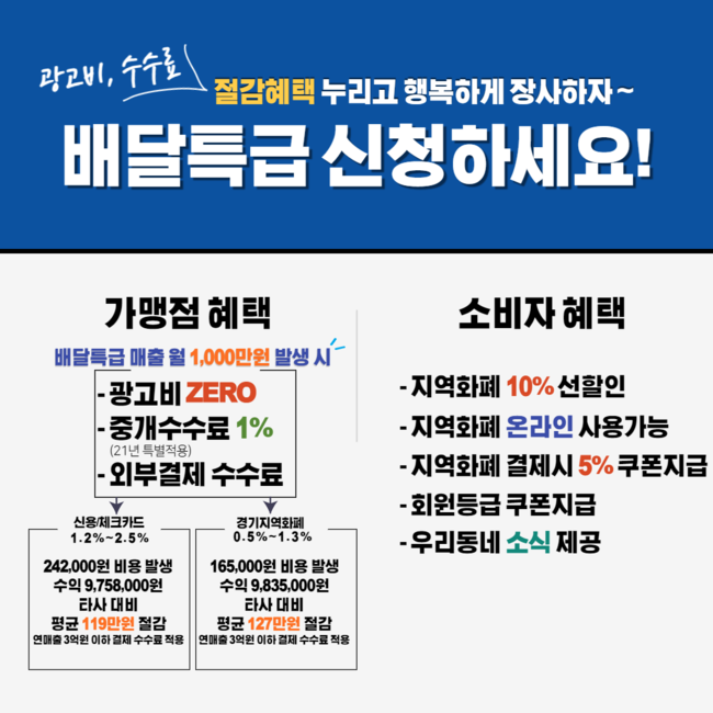 경기도주식회사가 만든 ‘배달특급’은 외식업에 종사하는 소상공인을 위한 배달앱이다. 광고비가 없고, 중개수수료가 기존 배달앱보다 적어 가맹점은 비용을 줄일 수 있다.