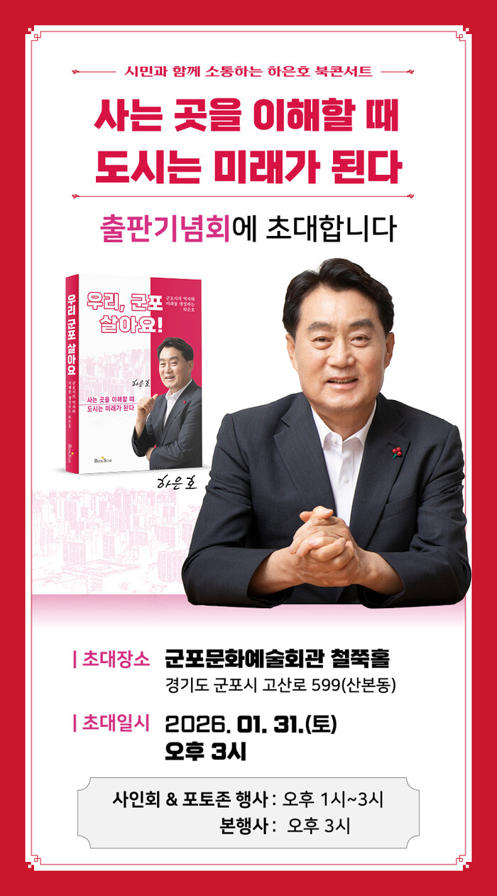 하은호 군포시장이 저서 '우리 군포살아요' 출판을 기념하는 북콘서트를 1월 31일 오후3시 군포문화예술회관에서 연다.