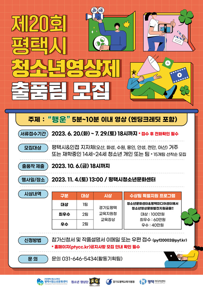 영상단RG 회장 박소정(한광여고 2학년)은 “이번 영상제는 청소년이 생각하는 행운을 바라보고 소통하고자 주제를 선정했기에, 출품하는 청소년이 다양한 행운에 대해 표현해 볼 수 있는 기회가 되었으면 좋겠다”며, “출품팀 모집 대상을 평택시 인접 지자체로 넓히고 24세 청소년까지 모집하는 만큼 많은 관심과 참여 바란다”고 말했다.