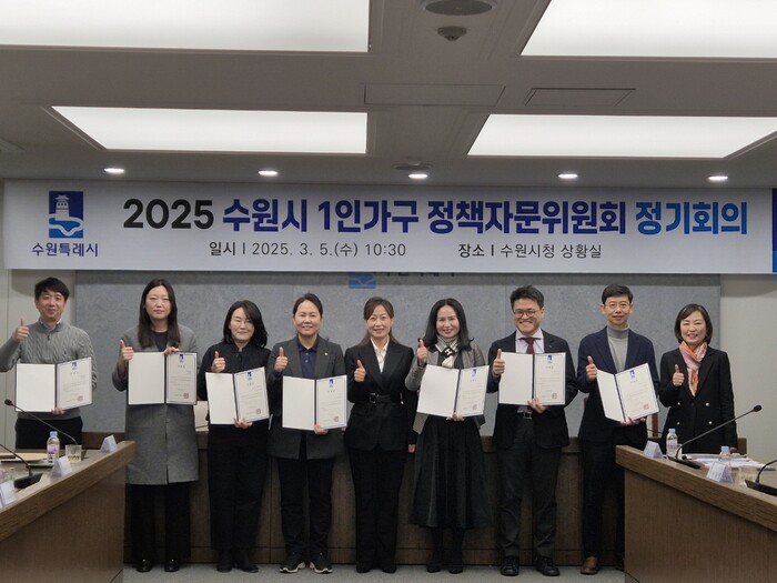 1인 가구 정책자문위원회는 당연직 위원 2명을 포함해 수원시의회 의원, 1인 가구 정책 분야 교수·전문가 등 9인으로 구성됐다. 기존 사업 모니터링, 신규사업 제안, 현장 정책 수요와 정책 사례 공유 등 수원시 1인 가구 지원 정책 사항 전반을 심의·자문하는 역할을 한다.