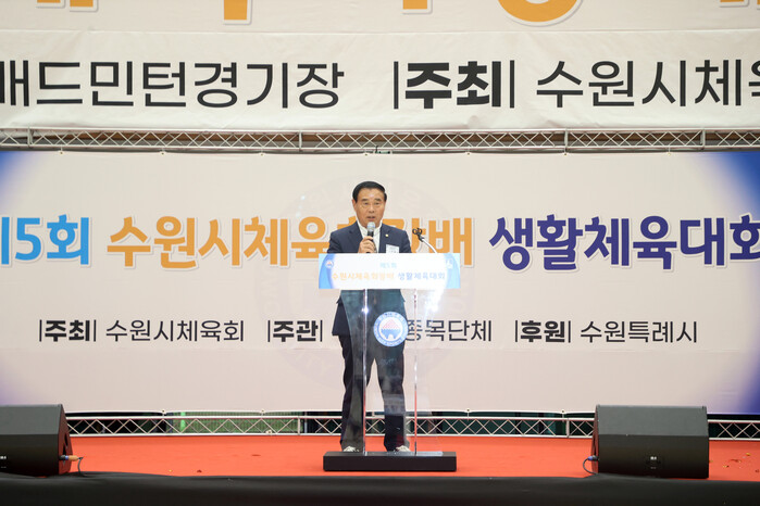 수원특례시의회 이재식 의장은 지난 21일(토), 수원배드민턴전용경기장에서 열리는 ‘제5회 수원시체육회장배 생활체육대회’ 개회식에 참석하여 선수들을 격려했다.