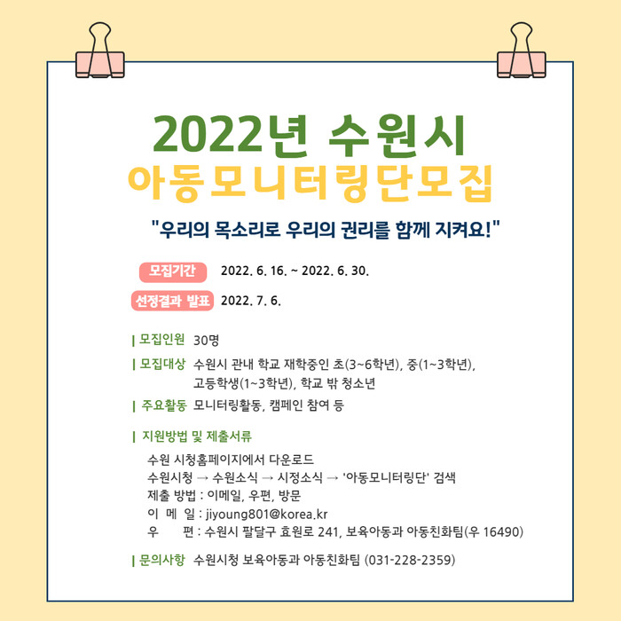 신청 서식 등 자세한 내용은 수원시 홈페이지(www.suwon.go.kr) ‘시정소식’에 게시된 ‘2022년 아동모니터링단 모집 안내’에서 확인할 수 있다.
