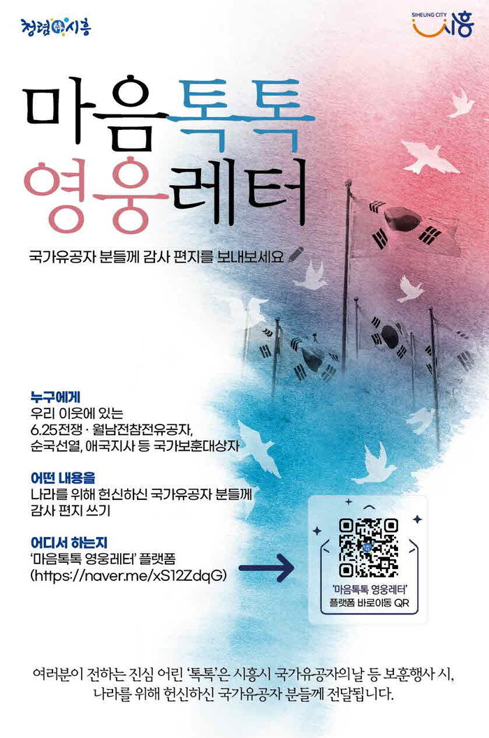 호국보훈 디지털 감사편지 ‘마음톡톡 영웅레터’는 국가유공자와 그 가족에게 시민의 따뜻한 메시지를 전달하고, 세대 간 공감과 존중의 문화를 확산하기 위한 시민 참여형 보훈문화 프로그램이다. 시민 누구나 홍보물에 있는 정보무늬(큐알코드) 및 링크를 통해 손쉽게 편지를 작성할 수 있으며, 작성된 편지는 오는 7월 8일에 열리는 ‘시흥시 국가유공자의 날’ 기념식을 비롯한 주요 보훈 행사에서 국가유공자에 전달된다.