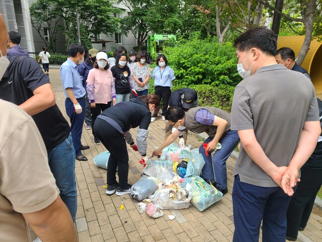 관리사무소장·관리원, 입주민, 김기배 환경국장을 비롯한 수원시 공직자 등이 종량제 봉투를 개봉해 배출 기준에 못 미치는 쓰레기가 있는 지 확인한다.